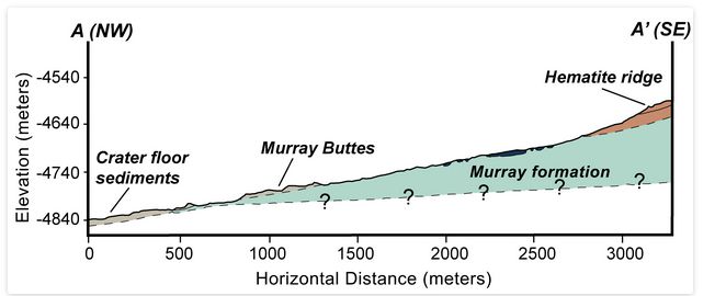The Murray formation extends about 200 metres (650ft) up the side of “Mount Sharp”. Starting at the “Pahrump Hills” below “Murray Buttes” in late 2014, Curiosity is about one fifth of the way across the region, spending extended periods examined various features within the formation. Credit: NASA JPL