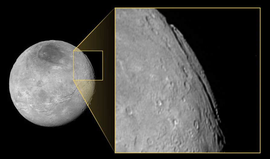 At the same time the ocean paper was published, NASA / SwRI released a new image of Pluto’s partner / moon, Charon, revealing a huge “grand canyon” scoring its surface. Informally named “Argo Chasma”, it was fortuitously imaged by New Horizons high up on Charon’s limb, with sunlight falling across it in a way which made it possible for its overall dimensions to be approximated. It is believe to be a total of 700 km (430 mi) in length and around 9 km (5.5 mi) deep. By comparison, Arizona’s Grand Canyon is 450 km (280 mi) long and roughly a mile deep.