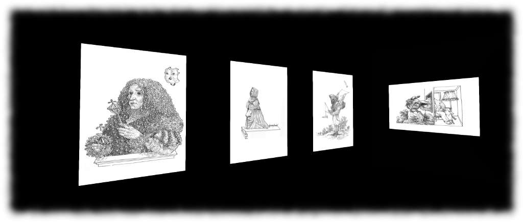 In an exhibition as remarkable as this, it is difficult to draw attention to any particular aspect, as they are all deserving of our time and attention. However, there are two parts within Peter Vos in Second Life which should perhaps be given additional mention. The first is on the ground floor of the hall, where Karkassus presents reproductions of the miniatures his father started painting in 1966. And by miniatures, I mean entire paintings and portraits the size of a rijksdaaldar – just 33 mm (1.3 in) across; so small some of the detailing meant working with just a single hair on a brush.