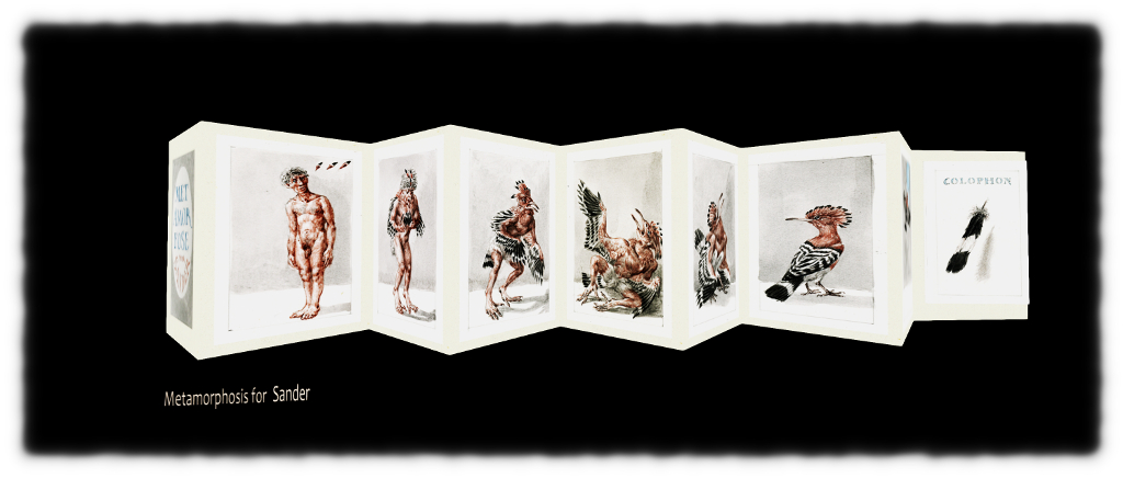 On the upper floor of the exhibit, nestled between the images on display is another personal tribute to the artist. Lit by a single lamp sits his desk, chair pushed back. The paraphernalia of Vos’ work are scattered around: books reflecting his interest in mythology sit on the floor, while pencils, pens, ink, coffee, a pouch of tobacco and more, vie for space beneath the cone of light cast by the lamp. And amidst all this, again marvellously reproduced and scaled for avatars, are the artist’s notebooks, displaying his meticulous studies of birds. Looking at them, it is hard not to believe he has simply stepped away from his work for a minute or two, and if we wait quietly enough, he’ll return, and allow us to watch him as he continues sketching a sparrow.