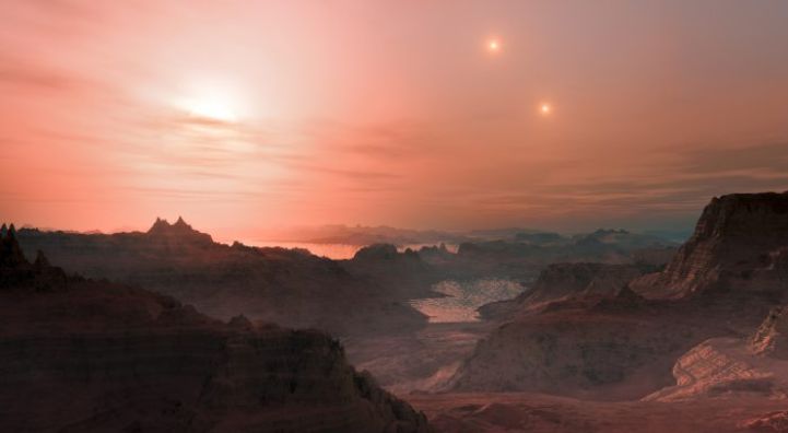 Suns over an alien world: an artist’s impression of the view from an “Earth-like” planet orbits our nearest stellar neighbour, Proxima Centauri (seen closest, left), with Alpha Centauri A and B shining in the distance – story below. Credit: ESO/L. Calçada