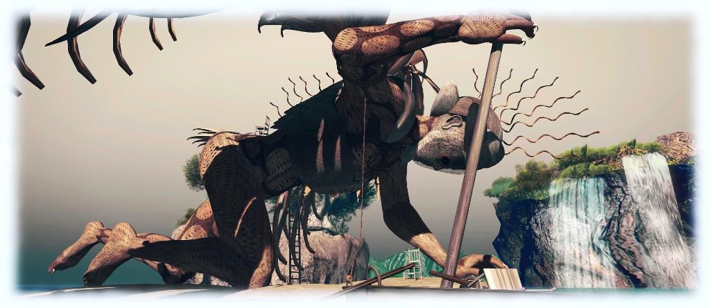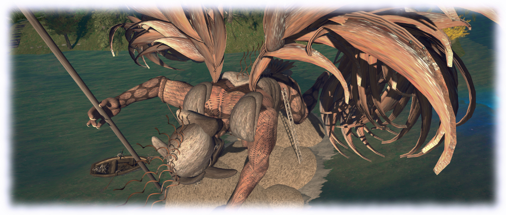 The Enkeli is an imposing figure set upon s sand bar surrounded by a landscape of rugged island in keeping with the journal’s description. Helmeted, with spread wings ruffled and in disarray, his is collapsed on hand and knees, as if exhausted. A great lance is held tightly in his right hand, blunt end thrust into the ground, tip pointing skyward, gripped as if he might be about to lean on it for support to regain his feet. Wooden chairs and a ladder invite visitors to explore the figure after the manner of Pomfret and his companions, while a rowing boat is moored alongside offers a further indication of scale.
