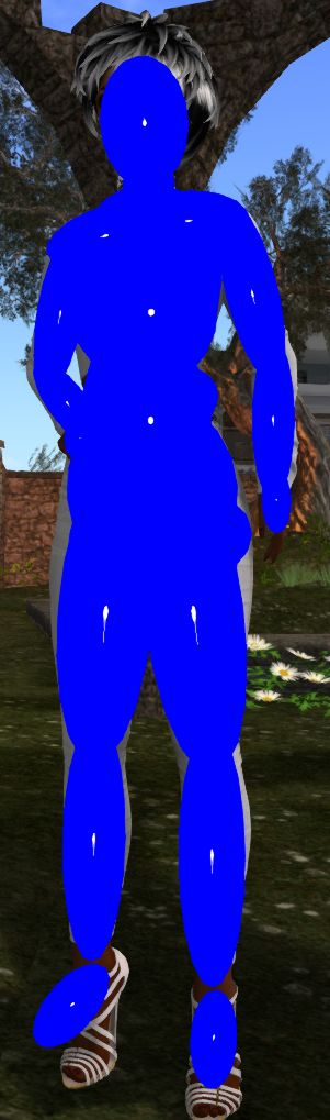 This will overlay the avatar with a series of oval shapes (official viewer – other viewers may render the collision skeleton slightly differently) which show the position of the volume bones. The closer these match the shape an avatar (something which may not always be possible, depending on the avatar type / size), the easier it will be to zoom in on the avatar and / or click on it.