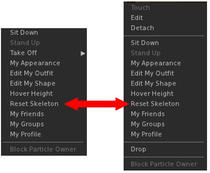To overcome this in the Bento viewer, there is a Reset Skeleton option, which can be used on either yourself or other deformed avatars in your view. This can be found in the avatar name tag context menu, or the avatar context menu, either of which can be access by right-clicking on the name tag or avatar respectively.