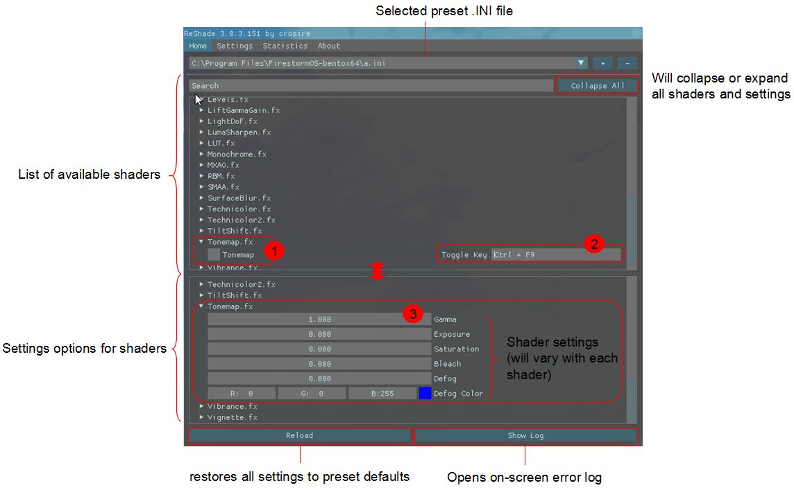 As well as the Home tab, the Reshade 3.x Settings tab may be of interest. This allows users to set certain options, including: