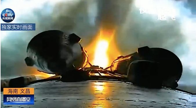 The Long March-5 is a two-stage rocket, the first stage comprising a central core supported by four strap-on boosters. These give the vehicle 10 rocket motors at launch, fuelled by a mix of liquid hydrogen / liquid oxygen or liquid kerosene/liquid oxygen, marking a significant move away from more environmentally hazardous fuels for the Chinese pace programme.