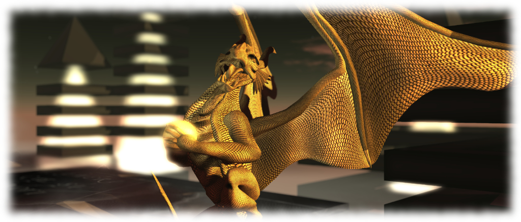 Within an abstract environment of ornate towers lit from within and semi-transparent floors, sit the dragons of the title. From Alpha’s notes, they stand as guardians of self; that this strange structure is perhaps – if I might borrow from the current British television incarnation of a certain sleuth) – a “mind palace”, in which is hid the wonders and terrors contained within our deeper selves; countries of the mind through which we might only travel with care, and having accepted the challenge presented by the dragon standing before each one.