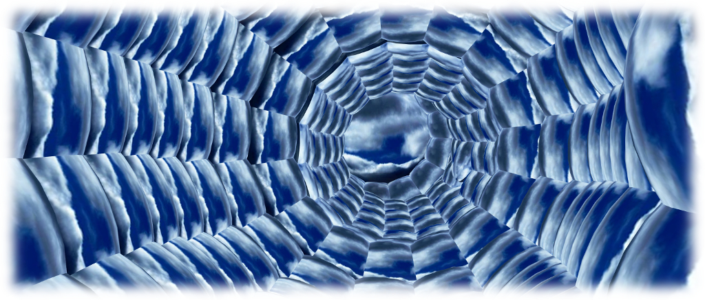 On entering the tube of the “optic nerve”, which undulates gently in a waveform, you are surrounded by a gently changing cloudscape (if the video surfaces aren’t in motion, toggle the media (film camera) button a few times) together with the sound of brds carried on a gentle breeze. But wait a few seconds and the collective scene will change: the wind rises as the rumble of thunder can be heard and the birds fall silent. Around you the clouds move faster and darken to swirl around you as lightning catches up with the roll of thunder, accompanied by a torrential downpour across the surfaces around you. Then, almost without warning, everything changes: the storm vanishes and white clouds move across a blue sky; you are in the eye of the storm. Wait long enough, and the cycle will repeat as you pass once more through nature’s fury.