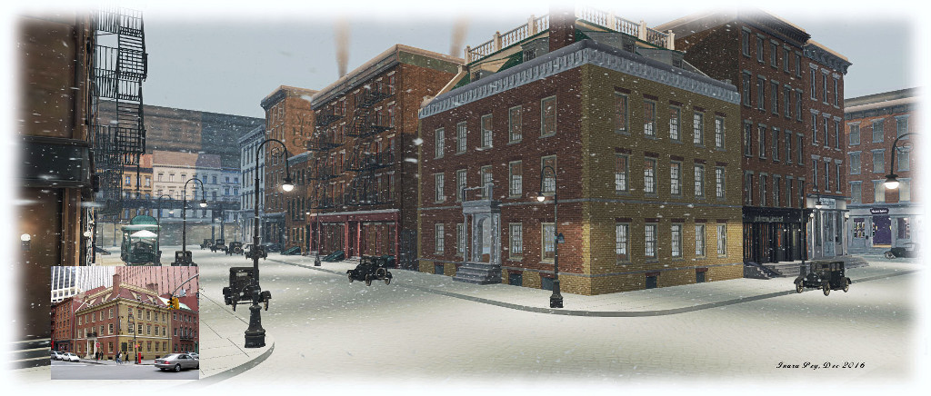 The work completed so far is impressive. Jogi has taken extraordinary care to recreate buildings from the period which actually existed (some of which still do today) along streets such as Pearl St and Water St in lower Manhattan. At street level, stores and boutiques line the sidewalks, with brick-faced and concrete apartment blocks rising 3, 4 or 5 stories above them, fronts often hung with the wrought iron railings and stairs of fire escapes, great ladders ready to drop to street level should they ever be needed.
