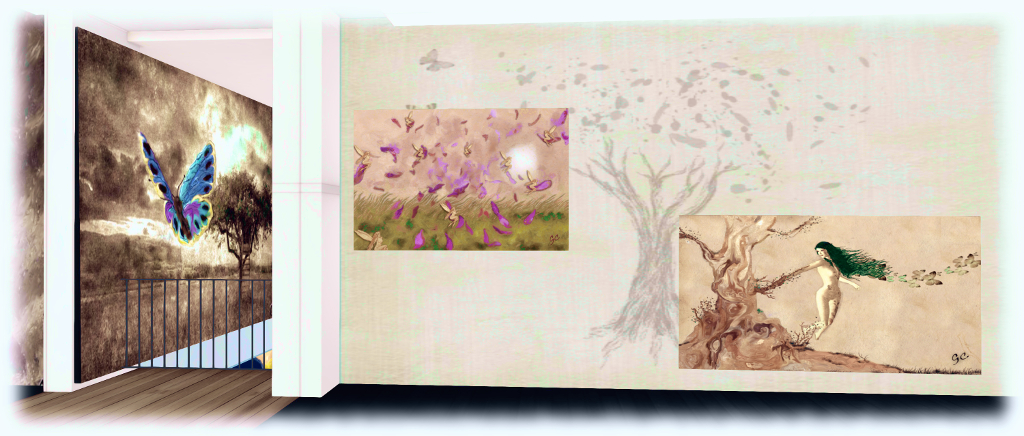 The gallery sits within a watery location, a set of round stepping-stones crossing the water from the landing point to the entrance. These bordered on one side by a 3D work by Gwen Ferox (violetile), and a story framed by a series of Grazietta’s paintings. Both reflect Grazietta’s love of narrative and in people allowing their imagination free rein.
