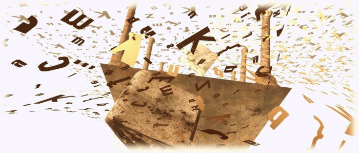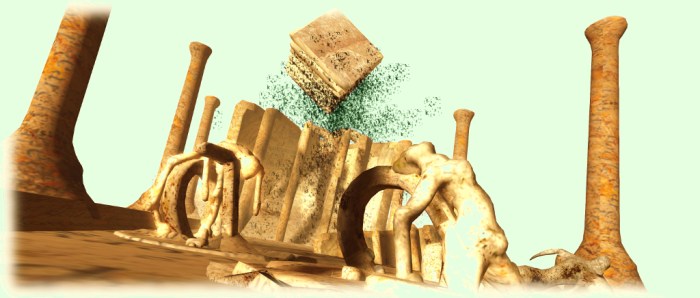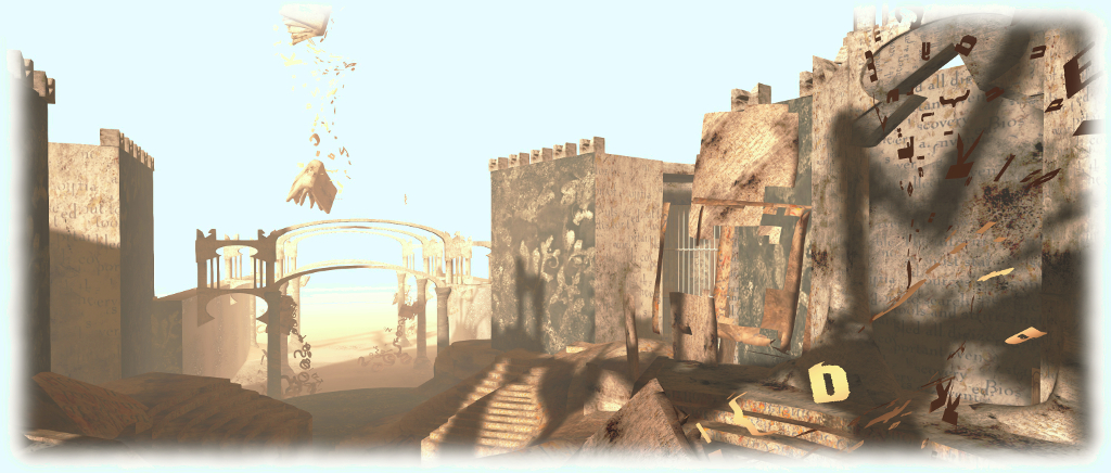 Three huge platforms float in the sky; one is the landing point where information on the installation and Split Screen can be obtained. The remaining two, one reached via a walk through a tornado of golden letter and the other by flying down to it, offer huge columned but roofless halls. The floors of each resemble printed pages from which stone letters partially rise, draped with human figures who appear to be merging with them. Over both, giant books spill a black torrent of letters.