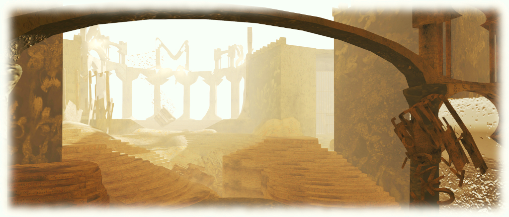 Beneath all three, at ground level (fly down to reach it) is an enormous fortress, slowly decaying, the roof gone, the floors pitted and broken, the walls collapsing. Throughout its bulk can be found the essence of words: letters can be seen parts of the walls or hang like broken chains from columns, printed pages form the lumps and undulations of the floor. More letters are locked within great cells, or have fallen into the pitted floor.