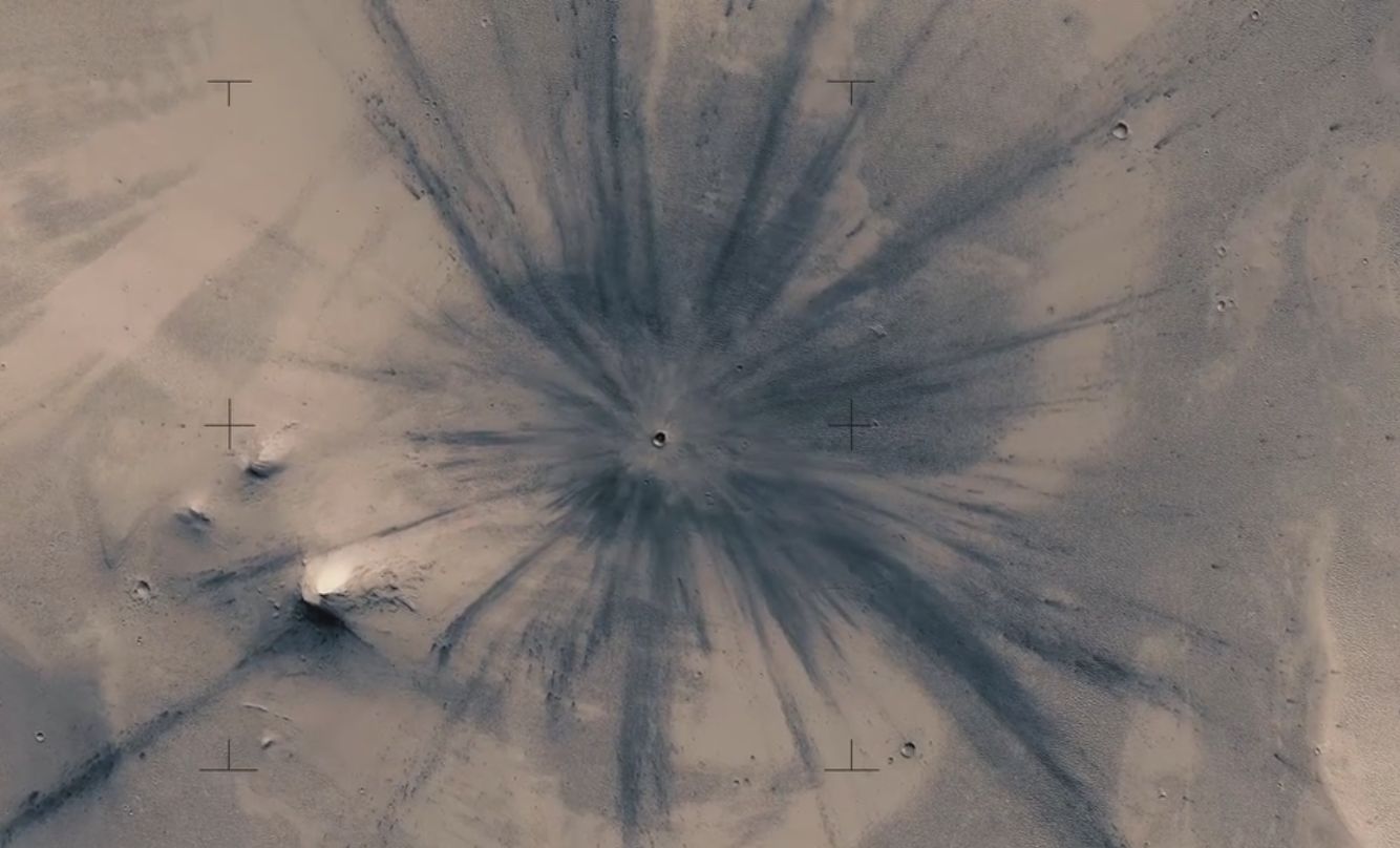 It’s a stunning piece showing many of the more intriguing features of Mars: the recent impact crater see in the still at the top of this article; the ice walls and melt holes of the Martian poles; gullies and cliffs rutted and marked by RSLs – recurring slope lineae – which might or might not be the result of liquid activity; the ripples of sand dunes, and the winding forms of channels which might have been shaped by the passage of water.