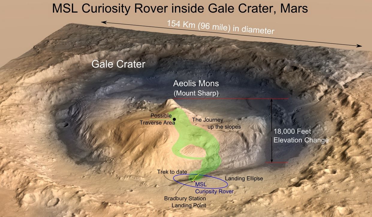 A rover’s progress: the 16 km (10 mi) travelled by Curiosity so far, and potential for future explorations up the side of Aeolis Mons. Credit: NASA/JPL / T. Reyes