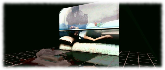 Located high above ground, the exhibition space a place of geometries and reflections. A large grid forms the main platform crossed – literally – by two footpaths. At one end of this grid is a tiered seating area, split along one axis to presented a mirrored arrangement. Facing this, at the far end of the grid, sits a black hemisphere. set between the two are four cubes and two pyramids, neatly arrayed in two sets of three – again as if reflecting one another – either side of the path running from the seating area to the hemisphere. All of these elements – seating, cubes, pyramids and hemisphere are additionally “reflected” by copies beneath the grid, mirroring their placement.