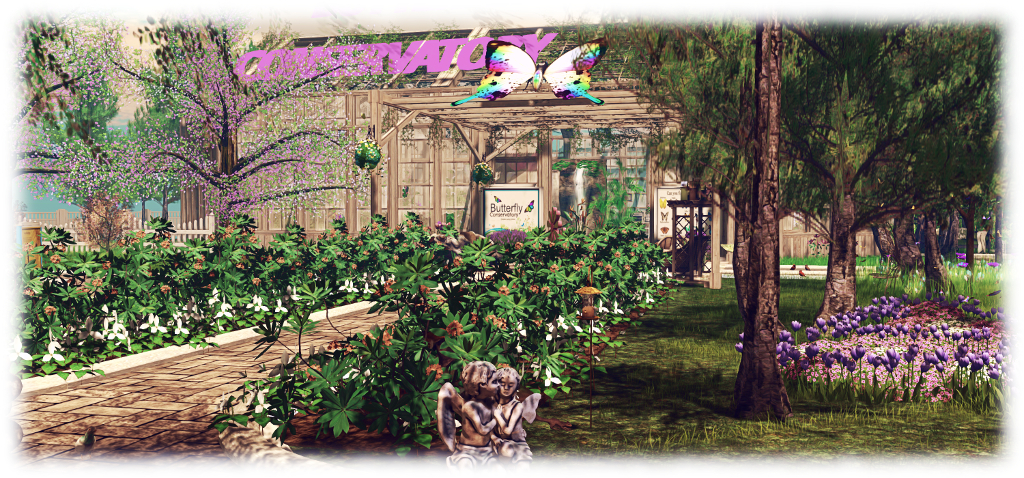 The work of Ry Heslop and Kacey Heslop (Kacey Delicioso), the Butterfly Conservatory occupies one half of a sky platform above their full region home, where it is located within a delightful garden suited to a range of viewer-side windlights.