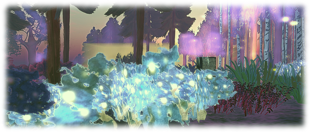 Like her earlier installations in the series, Niamh’s Journey (if I might shorten it so), take the visitor on a journey through a landscape as a painting, the tale of Niamh’s attempts to retrieve her lost dreams gradually unfolding through the use of in-world story chapters, featuring Cybele’s own art as a background to the text (the chapters also present visitors with a note card of the text for easier reading, if required).