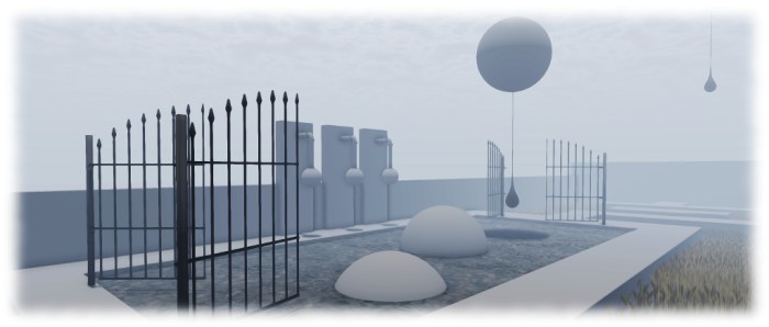From the landing point a fog-enshrouded landscape extends into the distance under a clouded sky. “Pollution,” Terry says of the fogging effect. The landscape comprises plain white blocks stretching over a dry grass land. Walk on the blocks – which might be perceived as city blocks – and they form paths running through the grass. Step down into the grass, and it becomes the path through a low-walled maze formed by the white blocks. Which you take is up to you.