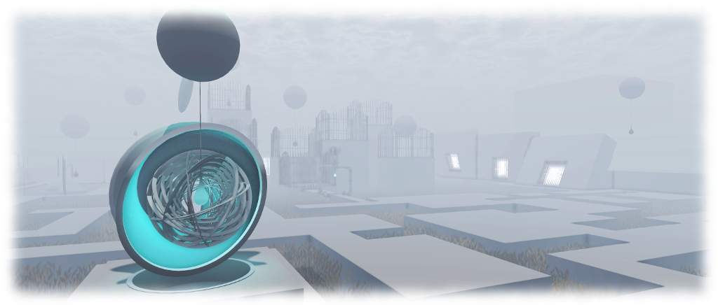 From the landing point a fog-enshrouded landscape extends into the distance under a clouded sky. “Pollution,” Terry says of the fogging effect. The landscape comprises plain white blocks stretching over a dry grass land. Walk on the blocks – which might be perceived as city blocks – and they form paths running through the grass. Step down into the grass, and it becomes the path through a low-walled maze formed by the white blocks. Which you take is up to you.