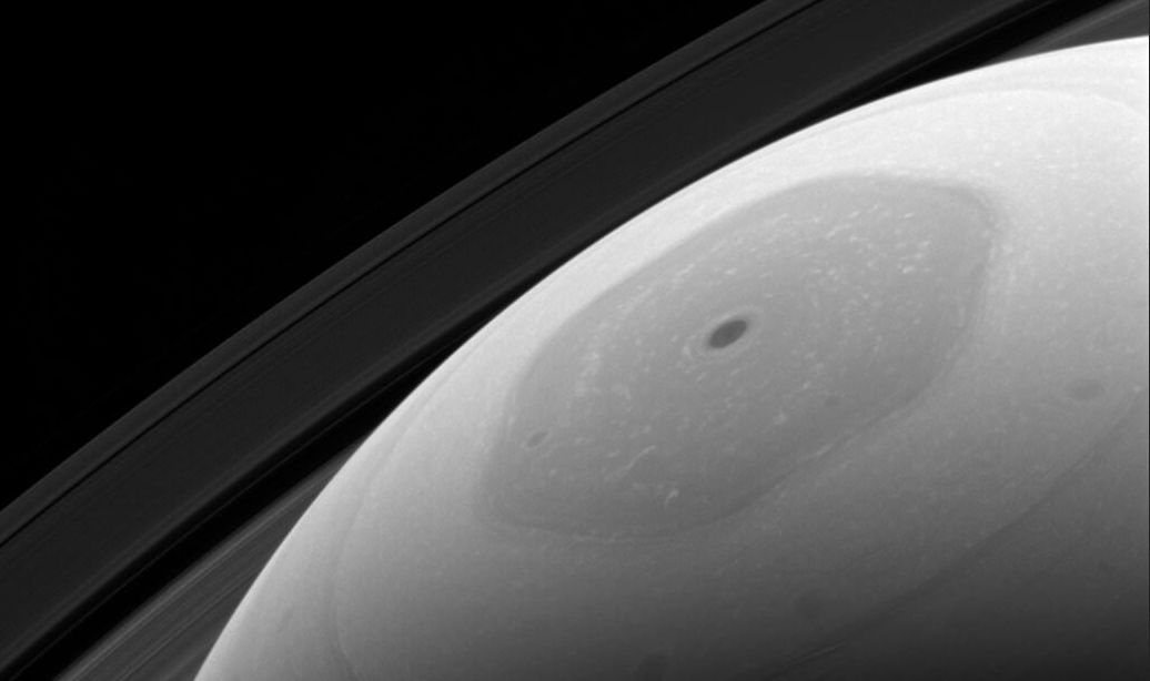 During the first passage between Saturn and its rings on April 26th, Cassini captured a string of black-and-white images of the region, include the vortex at the centre of the storm, which were subsequently stitched together into a short movie (above).