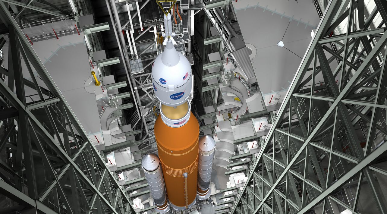 An artist’s impression of the Orion vehicle, in its launch shroud and with attached launch abort system, being attached to is SLS launch vehicle in NASA’s Vehicle Assembly Building. Credit NASA