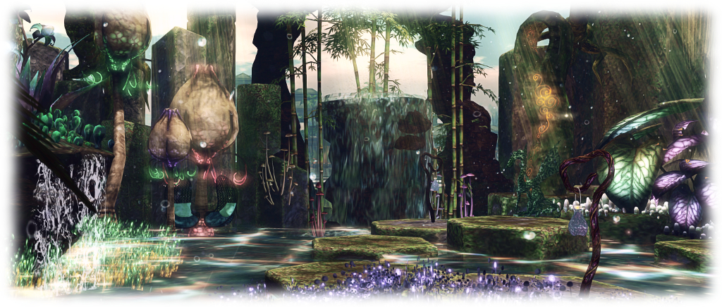 A sandy beach sweeps down the eastern shoreline of the land from the north, and out onto the slender headland, giving the impression that this is a stretch of coastline facing east, looking out to where a smaller island sits. Reached via a little motor boat available from a beach-side pier, this rocky island offers a little retreat, complete with summer-house, and a look-out point in the form of the disintegrating wreck of a boat made fast against the rocks. As the motor boat poofs when you leave it, getting back the mainland appears to be a case of flying or of teleporting back to the landing point.