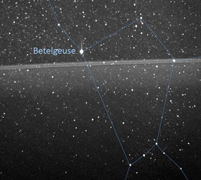 Captured by Juno’s Startracker navigational camera, is Jupiter’s ring system, which lies some 64,000 km (40,00 mi) out from the planet. Outlined in the backdrop of stars is the constellation of Orion (an excellent navigational aid), showing Betelgeuse (named), Bellatrix (Orion’s other shoulder, sitting on the line of Jupiter’s “gossamer rings”), and the stars apparently forming the line of Orion’s belt: Alnitak, Alnilam and Mintaka (l-to-r) sitting below the haze from the broadest and innermost ring as it disperses sunlight. This image was captured by the Juno mission on August 27th, 2016, during the vehicle’s first operational pass over Jupiter’s cloud tops. Credit: NASA/JPL / SwRI