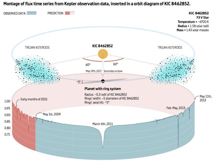 Using data from the May 2017 dimming and known prior events, they have built a model which explains the dimming in terms of natural phenomena. They propose that orbiting “Tabby’s Star” a massive planet, perhaps 1/3 the radius of the star, which has an extended ring system, perhaps 5 times the diameter of the star around it, inclined by 5-degrees. Sharing the planet’s orbit around “Tabby’s Star” at the L4 and L5 positions in front and behind the planet, are two truly massive stable clouds of Trojan asteroids.