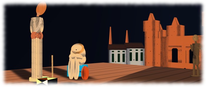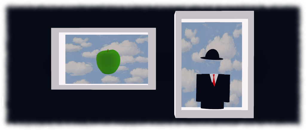 Beneath this, and reached via teleport board at the landing point sit the tributes to Giorgio de Chirico and René Magritte. In the early years of the 20th century, de Chirico founded the scuola metafisica metaphysical art movement, which profoundly influenced the surrealists. Featuring dream-like scenes offering strong contrasts in light and shadow and often with an undertone of mystery or threat, the movement flourished through the second decade of the 20th Century and is notable commemorated in this installation through the inclusion of a representation of The Disquieting Muses (circa 1917) and what might be a play on The Seer (circa 1914/15), together with architecture and backgrounds reflecting those seen in many of de Chirico’s works from this period.