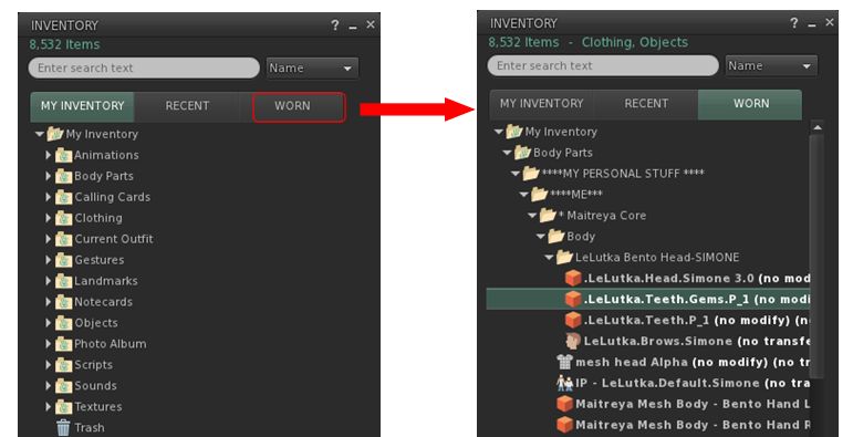 In terms of the updates, probably the most visible is the new Worn tab within the Inventory floater. Those who have used third-party viewers like Firestorm will be familiar with this: it presents a list of items your avatar is currently wearing, defined by the folders in which the items are located.