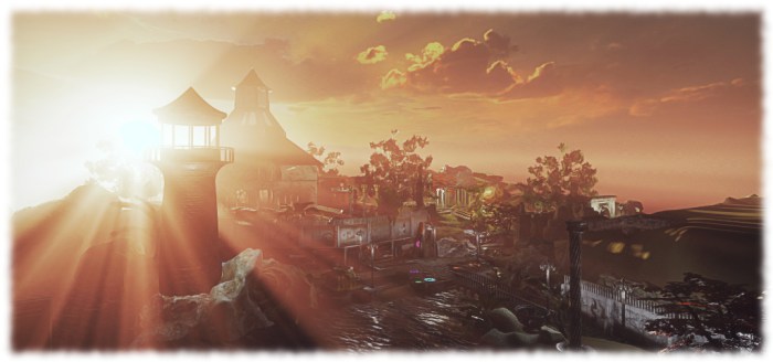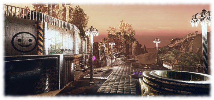 Facing the spawn point is a set of aged stone step and footpath, guarded by plant-bearing statues and lit by tall (electric? gas?) lamps. These point the way to a small greensward, again mixing futuristic metal stairs and free-standing hexagons with more traditional park benches. More stone steps set into the slope lead the way up to a paved plateau where sits what might be an old temple, the stonework weathered and partially exposed beneath what might once have been pristine white daub, but above which rises a new-look tiled roof.