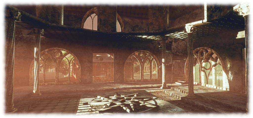 Alongside this temple is a small, more modern-looking building, the walls neatly squared and at least partially covered in a painted stucco finish and the windows neatly framed in wood. Empty inside, save for s set of stairs, this smaller building has both a balcony and rooftop terrace for looking out over the scene. The temple is more impressive: the wide, tall windows with their intricate stone arches suggest windows from a Norman cathedral, and allow the light of the lowering sun to stream through in streams of God rays, illuminating the temple’s interior and the cobbled area before it.