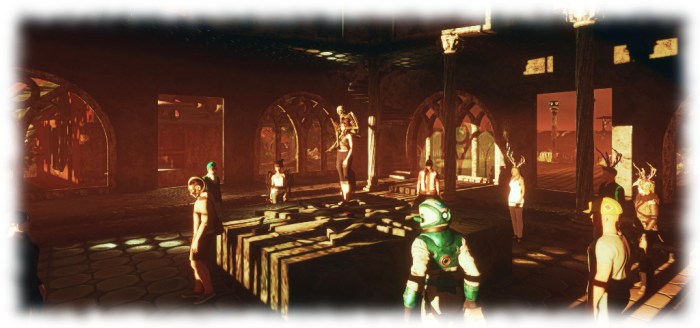 Outside, paths offer ways west, east and south. The latter is the shortest, running past an old church gatehouse (in which sits information on the region and a teleport up to the Urben Gallery, which will open on January 7th, 2018. This path ends at a wooden jetty where a rowing boat can be reached, providing the way to reach the remaining two islands.