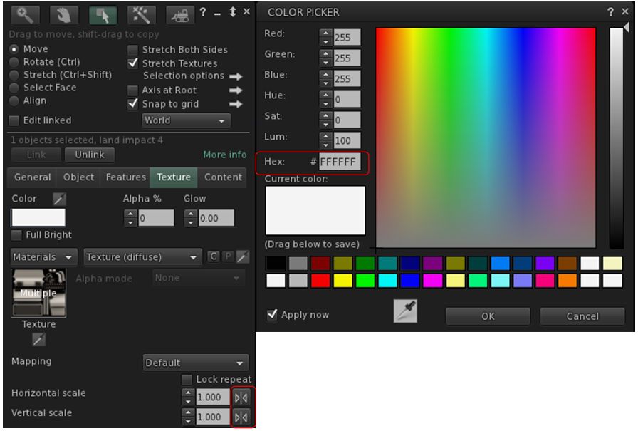 - Build floater updates: clicking the Flip button on the Build floater will flip the horizontal/vertical scale for diffuse, normal or specular maps depending on your current edit mode. When tinting objects, hex values are now accepted by Catznip R12.