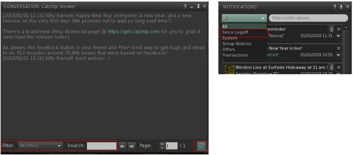 - Notifications update: R12 adds a Since Logoff option to the Notifications floater window. When selected, this only shows those notifications that were added since your last log-off (and any from the current log-on session).
