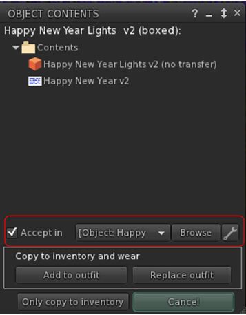 - Note that unchecking Accept In will cause the object to unpack to a top-level folder in your inventory.