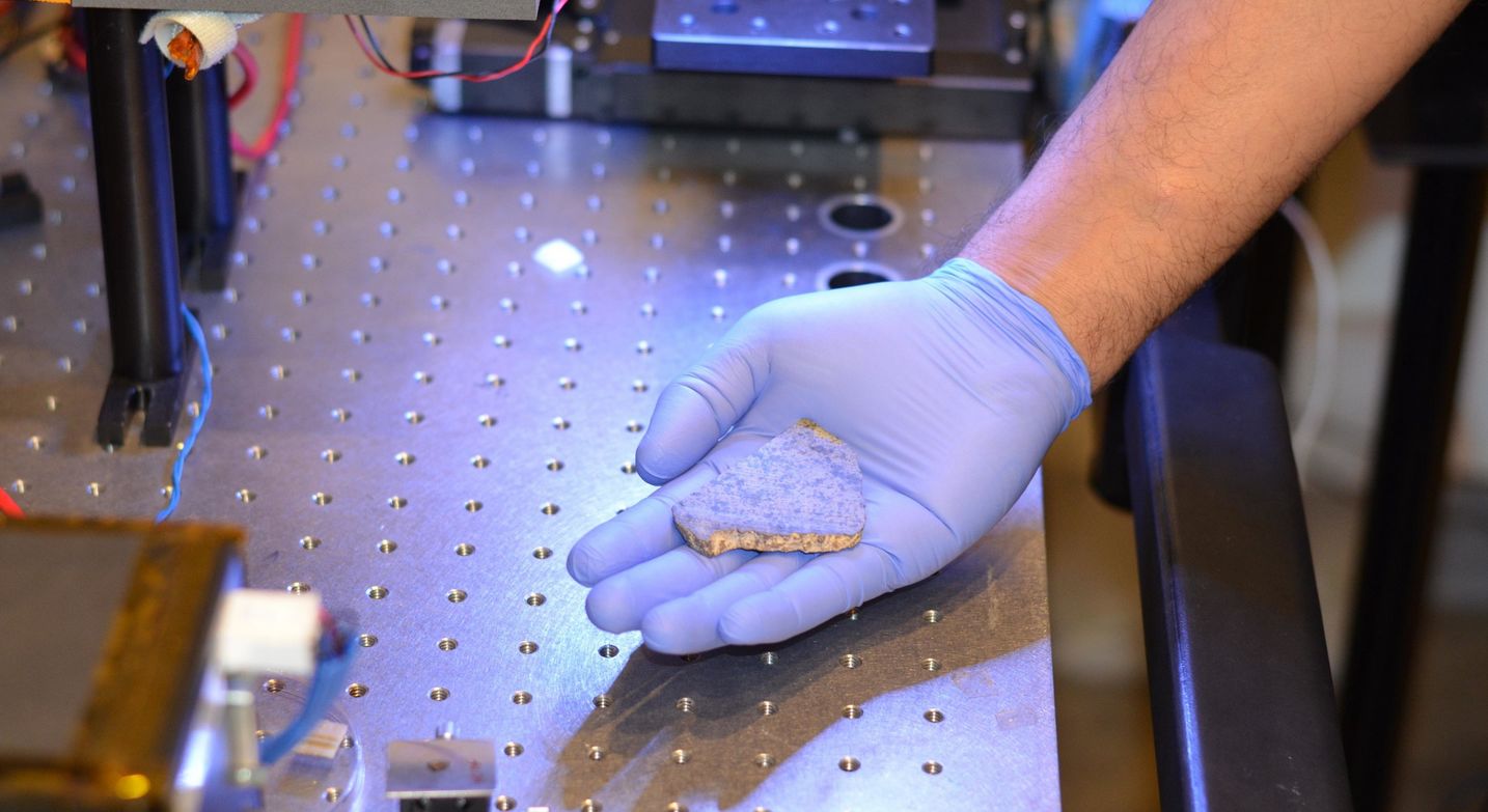 This particular meteorite was discovered in Oman in 1999, and has been under the care of the Natural History Museum in London, UK. It has been selected both because it has proven to be suitable to have a slice cur from it, and because it contains a mix of chemicals well suited to testing SHERLOC’s sensitivity to biosignatures. In all, two slices have been taken from the meteorite: one for Earth-based testing of the laser system, the other as the target which will be mounted on the rover itself