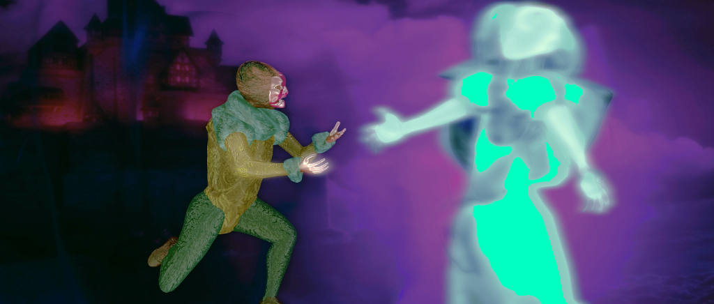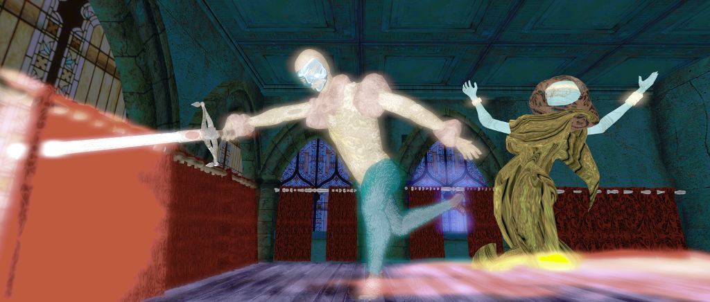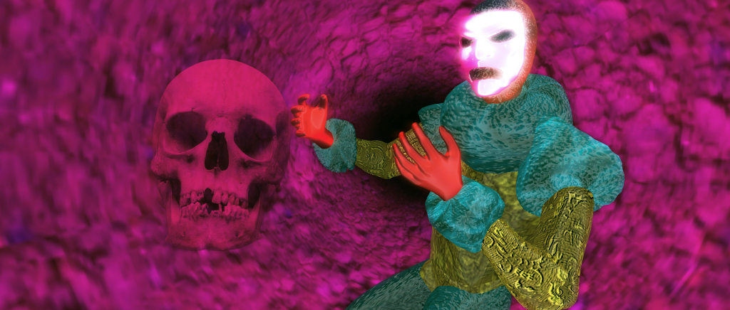 These scenes start with the sightings of the ghost of Hamlet’s father which set the events of the tragedy in motion, and conclude with Hamlet’s encounter with the skull of a jester he knew in his childhood (“Alas, poor Yorick. I knew him, Horatio: a fellow of infinite jest, of most excellent fancy; he hath borne me on his back a thousand times.” Between there sit the famous soliloquy, the murder of Polonius and the death of Ophelia. Modelled in 3D , using a mix of mesh and particles to achieve their effect, each offers unique view on the aspects of the play it represents, while the liner notes accompanying the installation offer further context, should it be needed.