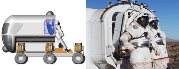 One of these is the idea of the “suit port”. This is effectively a space suit mounted on the outside of a living module or vehicle, complete with its own mini “airlock” built into the back pack. An astronaut using the suit climbs into it from the back, and when buttoned-up inside, a cover is sealed over the suit’s back pack to maintain the integrity of the living space before the astronaut detaches the entire suit to perform surface activities.