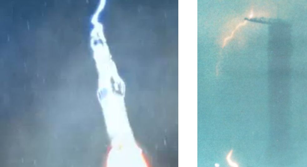 Apollo 12 launched on schedule from Kennedy Space Centre on November 14th, 1969, during a rainstorm. Thirty-six-and-a-half seconds after lift-off, the vehicle triggered a lightning discharge through itself and down to the Earth through the Saturn’s ionized plume. Protective circuits on the Service Module falsely detected electrical overloads and took all three fuel cells off-line, along with much of the Command/Service Module (CSM) instrumentation.