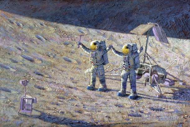 However, Bean had his own plans for the trip to the Surveyor vehicle: with Conrad, he conspired to smuggle self-timer for his Hasselblad camera in their equipment. The pair planned to secretly set-up the camera and use the timer to capture a photograph the pair of them standing side-by-side on the Moon – and confuse the mission control team as to how they had managed the feat! Unfortunately, Bean couldn’t locate the timer in their equipment tote bag until it was too late for the picture to be taken. Instead, he later immortalised the scene in his painting The Fabulous Photo We Never Took.