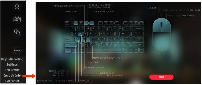 It is now possible to review controls now within the client for both Desktop mode (keyboard and mouse) and VR mode (both Oculus and Vive). In Desktop Mode this is achieved via the More Options > Control Info option.