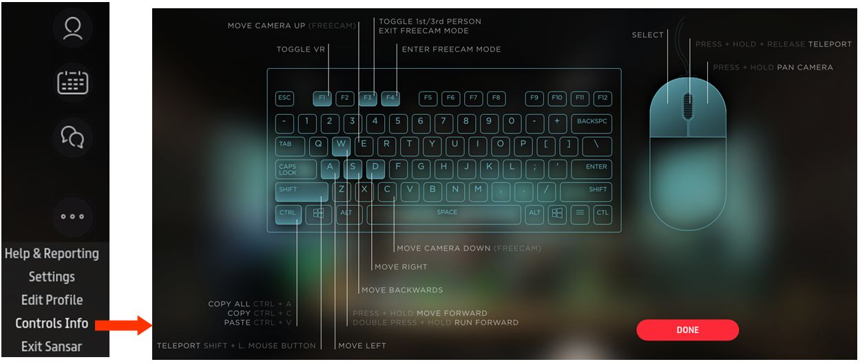 It is now possible to review controls now within the client for both Desktop mode (keyboard and mouse) and VR mode (both Oculus and Vive). In Desktop Mode this is achieved via the More Options > Control Info option.