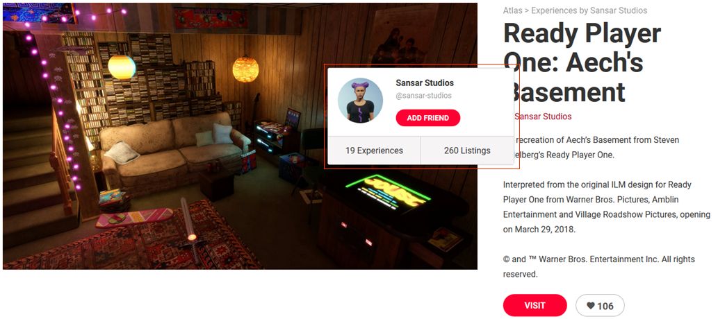 - Clicking on a Friend’s name will display a summary page of the experience(s) they have created (if any) and their Sansar Store listings (if they have made any).