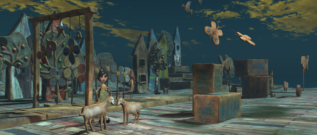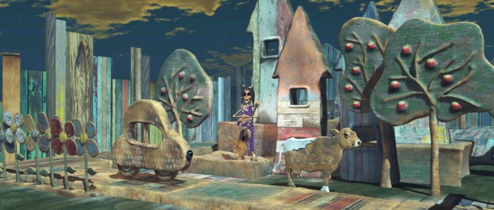 This is a place where finger-like houses rise alongside lollypop trees, and the locals add their own splashes of colour as they stand outside homes or carry out duties such as tending goats, picking flowers or simply having fun. A pancake car, its shape reminiscent of a Volkswagen Beetle rolls around the single road surrounding the town while fish atop unicycle like poles rolls back and forth on large tyres. It is, in a word, a fanciful place.