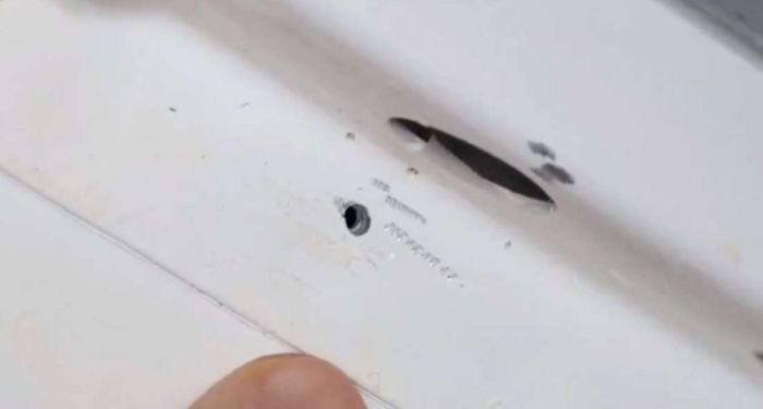 The damaged element of the Soyuz vehicle with a nearby drill hole and scuff marks. Credit: NASA