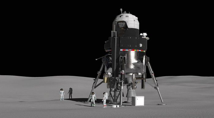 Looking a little like the oversized offspring of a liaison between the Apollo Lunar Excursion Module (LEM) and R2D2, the vehicle is designed to deliver a crew of four to the surface of the Moon, together with up to one tonne of equipment and supplies, and remain there for up to two weeks at a time as a base of operations for surface studies and exploration. Part of the cargo would be a small, unpressurised rover vehicle, possibly similar in nature to the rover used during Apollo missions 15 through 17.