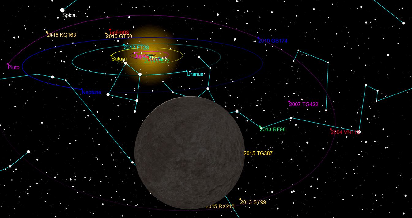 Simulated view of the solar system as seen from 2015 TG387, showing the orbits of major planets and positions of other extreme trans-Neptunian objects. Credit: Tomruen