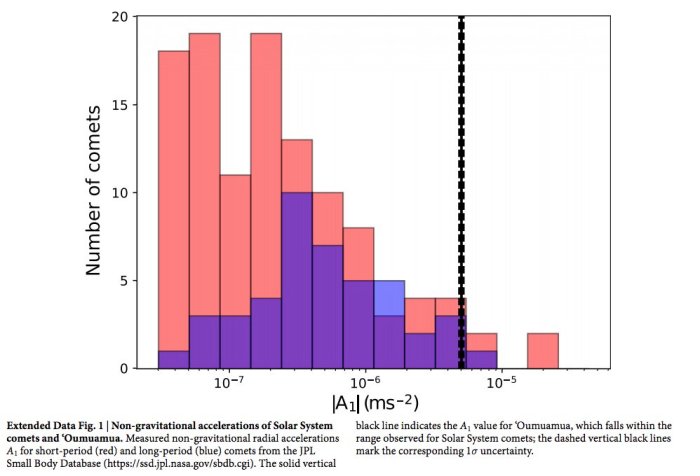 For example, the paper tends to dismiss the idea that ‘Oumuamua’s unexpected acceleration was consistent with a push from solar radiation pressure. However, Michele Bannister, a planetary astronomer from New Zealand and one of many to push back against the “ET probe” idea via Twitter, used a graphic that shows the acceleration exhibited by ‘Oumuamua’s is entirely in keeping with similar non-gravitational accelerations seen with comets within the solar system.