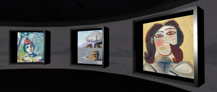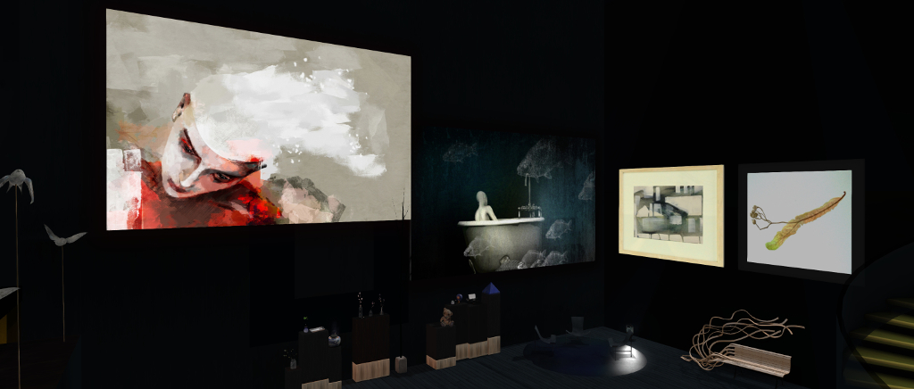 The 2D art can be found along the walls of the primary display space, just inside the main doors, and within some of the areas that appear set aside for resting and casual chat. The 3D elements can be found around the walls, mounted atop display plinths and – notably with Cica’s pieces – could be mistaken as part of the setting itself. Thus, careful exploration and study is advised!